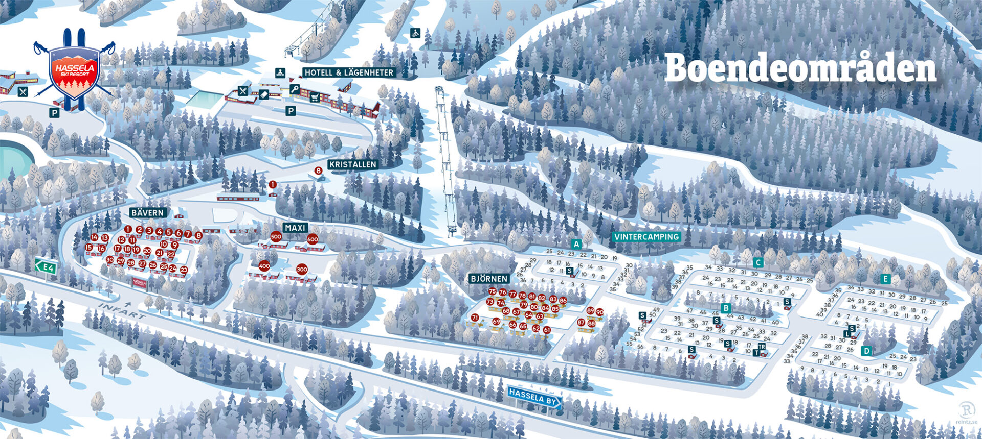 I boendeområdena på Hassela Ski Resort bor du bekvämt med gång- eller liftavstånd till skidsystemet. Vid Hotelltorget ligger Lodge Hassela, där receptionen finns för in- och utcheckning. Här hittar du även huvudanläggningen med Badpalatset, restaurang SkiLounge och skidshop.