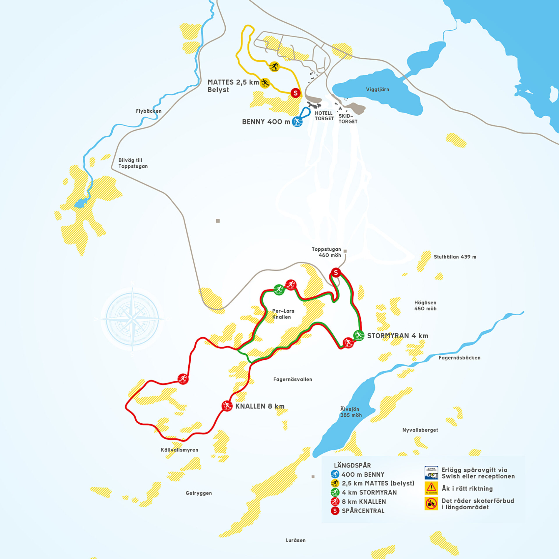 På toppen av Älvåsen väntar två natursköna spår – Stormyran och Knallen – på 4 respektive 8 kilometer. Spåren slingrar sig genom djupa skogar och över öppna myrar med storslagen utsikt. Ovana längdåkare rekommenderas att ta bilen till spårcentralen på berget. Mer erfarna åkare kan ta liften upp och avsluta turen med nedfarten Långsvängen.