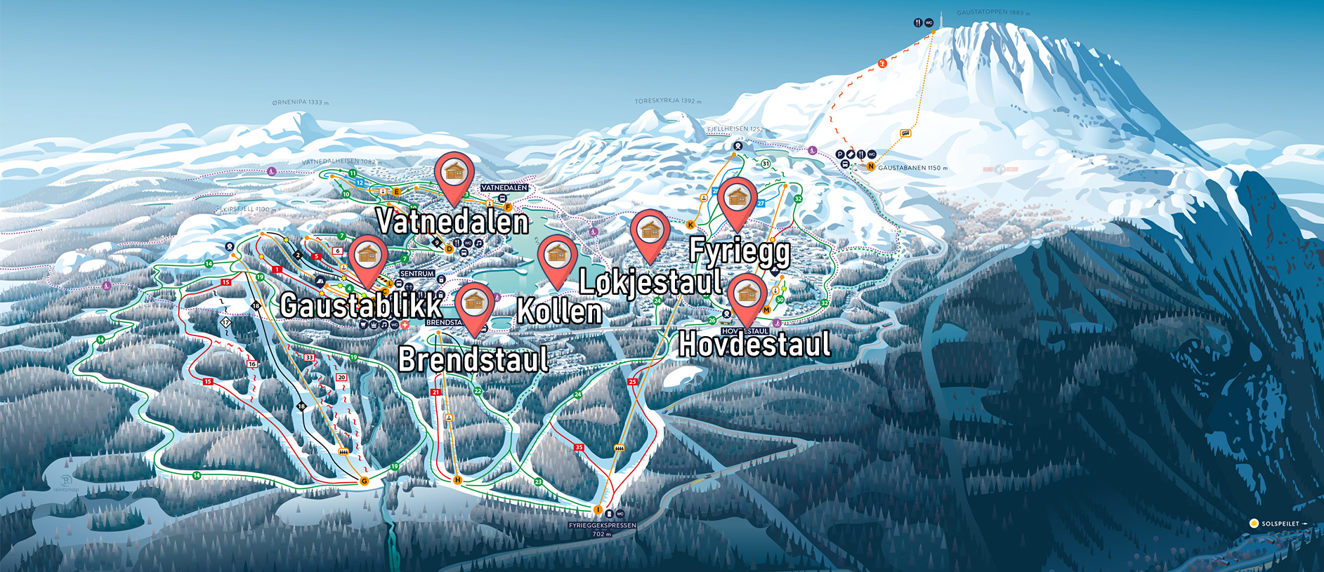 Ett perfekt utgångsläge för en härlig dag i skidbacken. Vangslia är känt för sina goda solförhållanden och sitt stora utbud av varierande nedfarter. Här finns något för alla – oavsett om du trivs bäst i snowparken, i familjeområdet eller i brantare terräng.