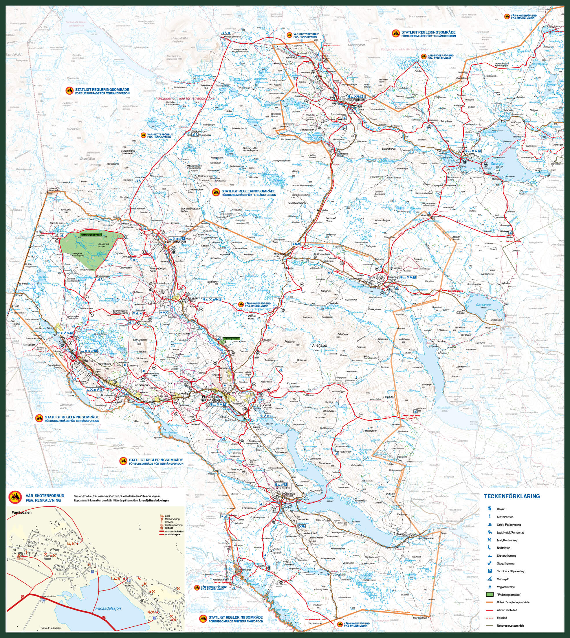 Åk skoter över högfjäll, genom vacker fjällbjörkskog och i vindlande dalgångar. I Funäsfjällen finns 610 kilometer skoterleder, varav 150 kilometer går över högfjället i ett av Sveriges vackraste fjällområden. De breda skoterlederna prepareras kontinuerligt för att hålla toppklass. Lederna är 5 meter breda, det finns 8 terminaler för av- och pålastning med gratis bilparkering i Funäsdalen samt 2 offpist-områden. Lederna är tydligt skyltade för säkrare vägövergångar och ledvärdar finns alltid på plats i ledsystemet.