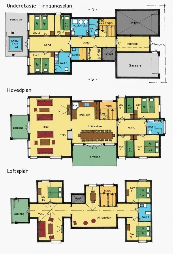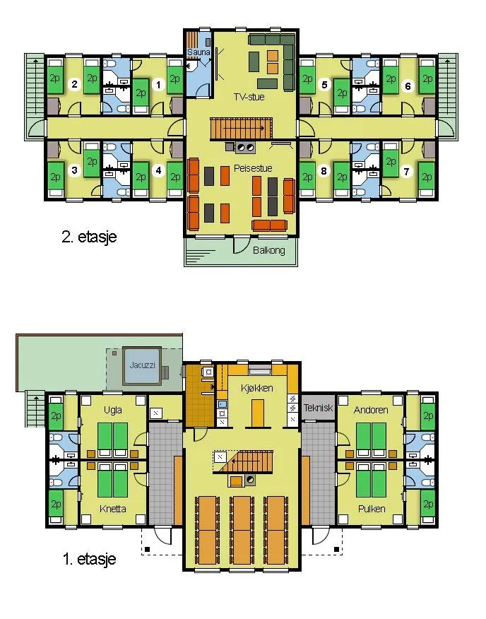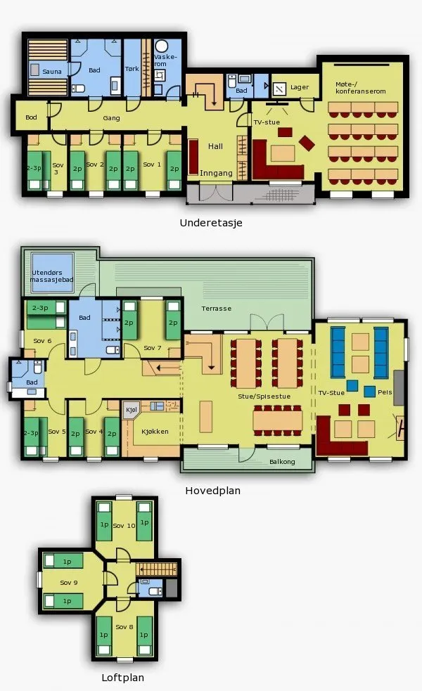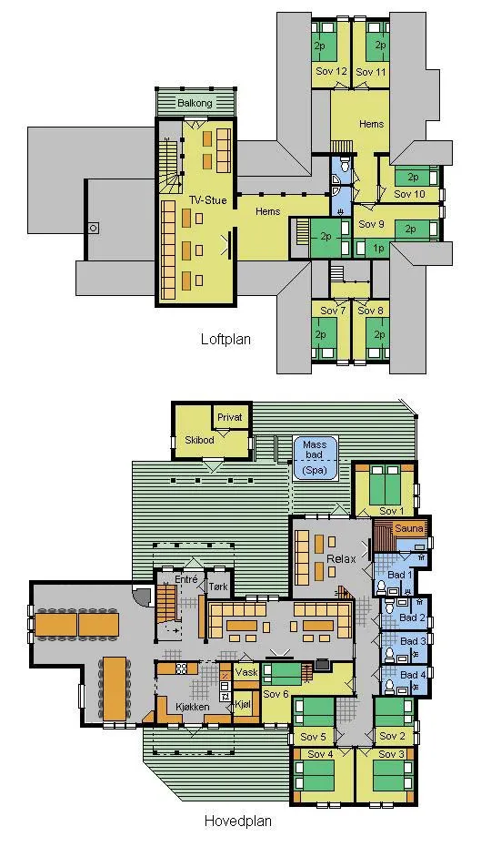 Stanarhaugen 33-35 bäddar. 270+45 kvm. 33-35 bäddar fördelat på 11 sovrum. Stor matsal med 34 stolar. Köket är praktiskt utrustat med 2 diskmaskiner, 2 ugnar och 2 spisar. I köket finns även frys och ett kylrum. Stugan har 5 dusch/WC (ett badrum med 2 duschar och bastu).