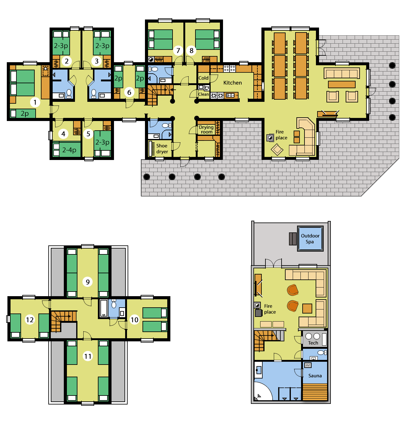 Totalt 31 sängar / 11 sovrum / 7 badrum / 3 kök / sällskapsrum / 1 spaavdelning / 1 vinkällare / 1 garage