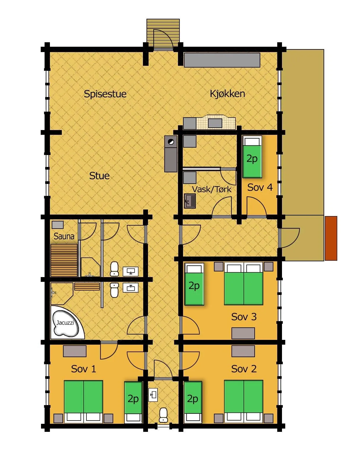 Stor sällskapsstuga med öppen spis i 3 avdelningar. Välbefinnandeavdelning med bastu, ångbad och stor jacuzzi (kan användas mot pristillägg). Stugan är rökfri och husdjur får inte medtas utan överenskommelse.